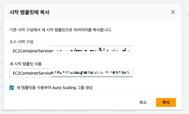 2. 해당 ASG 체크하고 '시작구성' - '시작 템플릿에 복사' - '선택 항목 복사'
