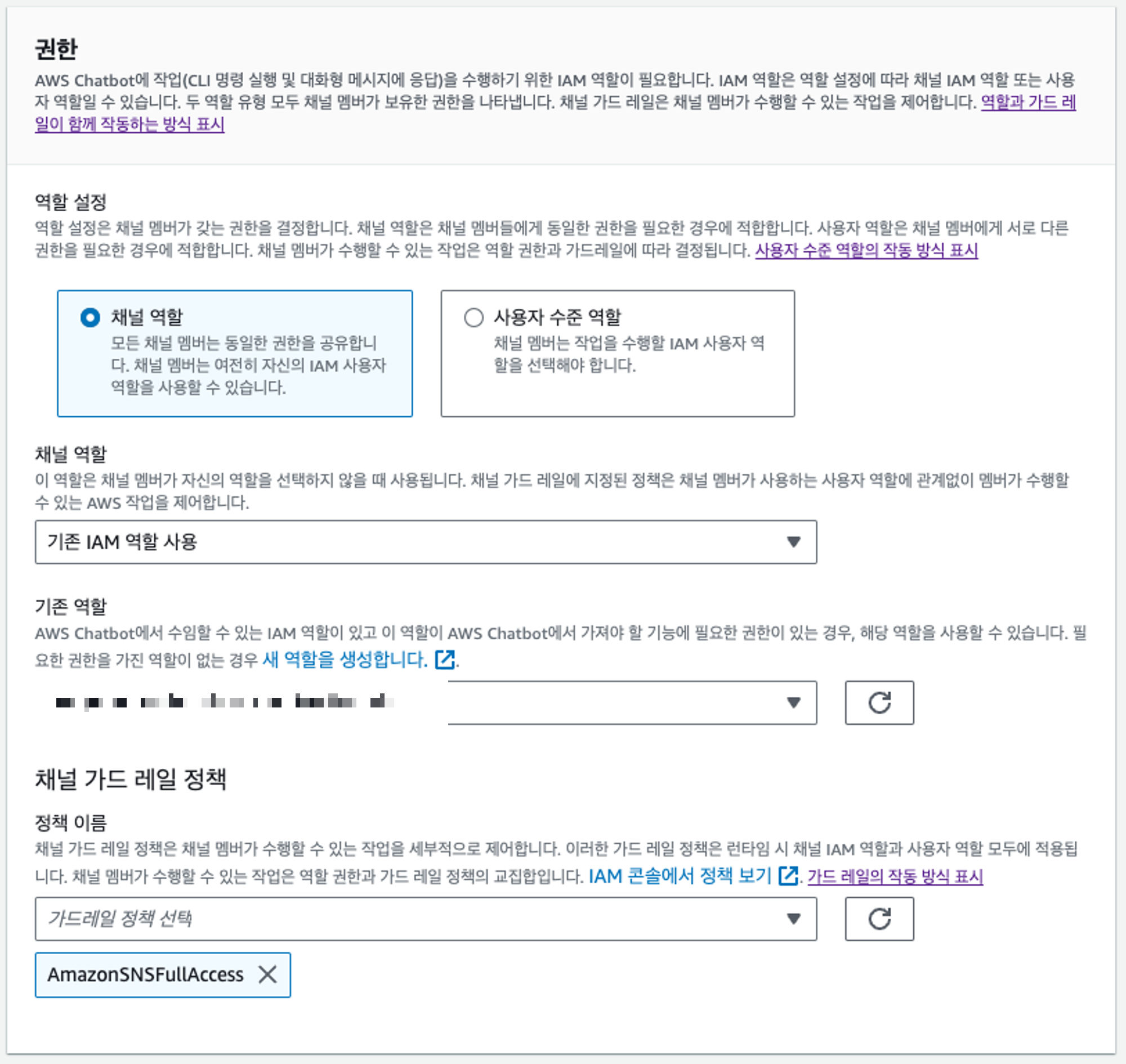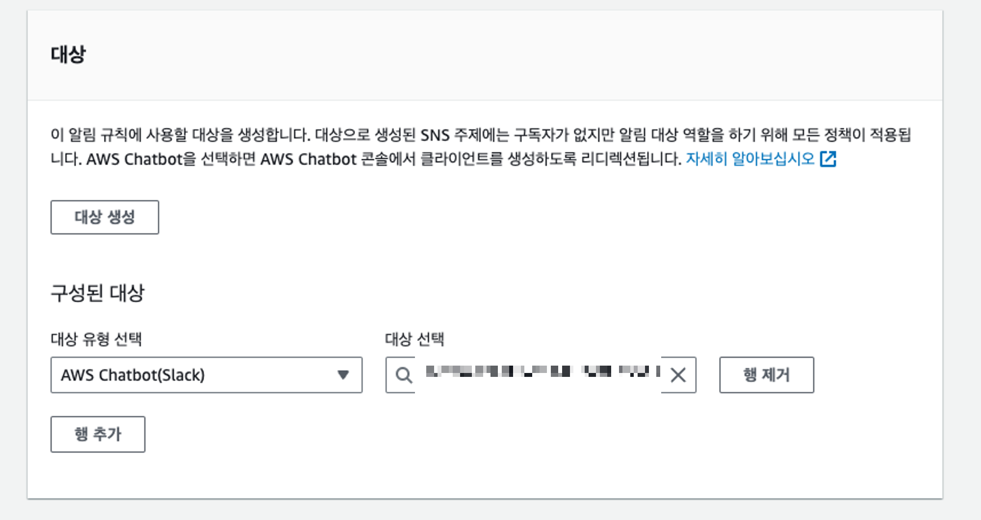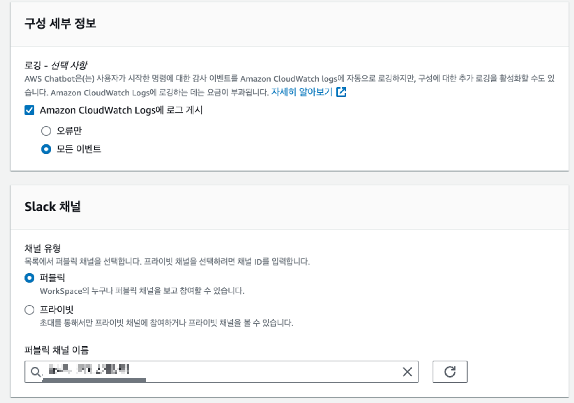 - AWS Chatbot (Slack) / 생성한 chatbot 클라이언트 arn 선택