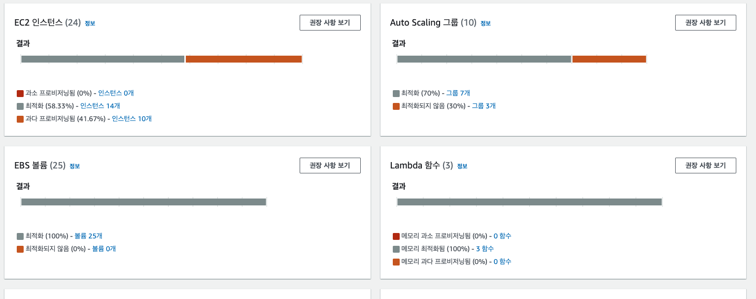 그리고 다음에 사용할 수 있는 서비스는 '비용최적화 허브'인데 활성화 해두면 AWS Compute Optimzer 와 Cloud Watch 를 통해 사용률 지표를 받아 리소스들의 사양에 대한 최적화 분석을 해준다고 한다.